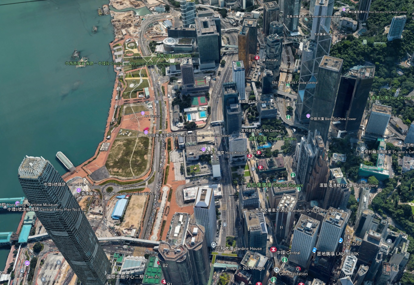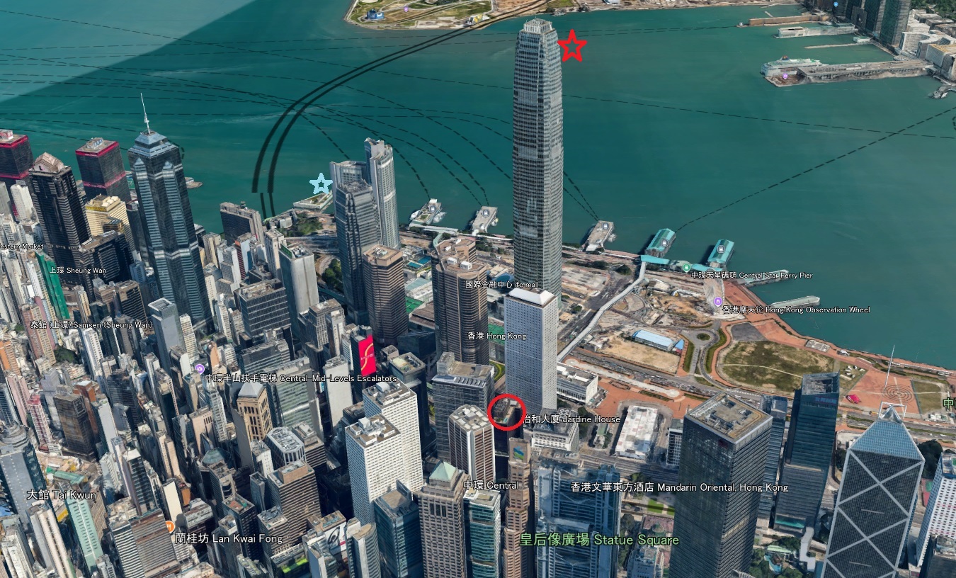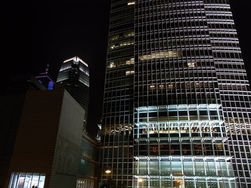 ![]() 北西方向。左の青いのは中環中心(高さ346m The Center)。右の奥は国際金融中心・第一期(高さ210m One International Finance Centre上の俯瞰写真の水色の星) 手前は左から置地遮打(LANDMARK CHATER)、康樂廣場(two Exchange Square)、怡和大廈(Jardin house) |