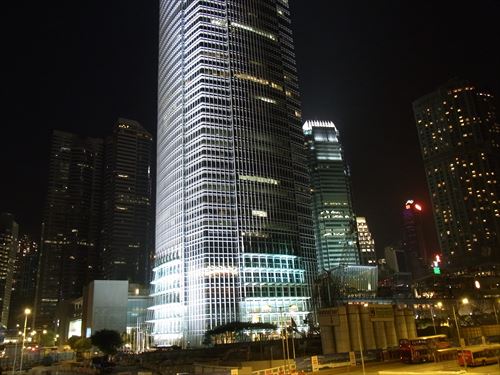![]() 左が国際金融中心・第二期 高さ415m Two International Finance Centre 香港の経済の中心地である香港島・中環(Central)に聳え立つランドマークタワー。415m。環球貿易廣場とは海峡を隔てて向かい合っている。 設計者はシーザー・ぺリ。香港国際空港への発着駅となる香港駅の真上に8年の歳月をかけて整備された。 毎夜実施されるライトアップショー「シンフォニー オブ ライツ」でも中心的役割を果たす |