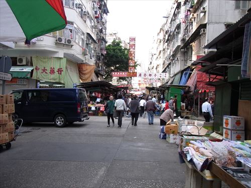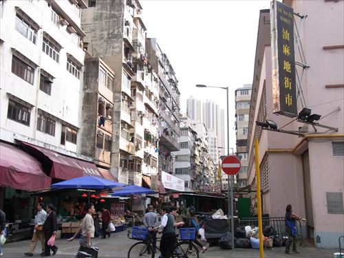 ![]() 手前の写真の南方向。新填地街(干拓街 Reclamation Street)右は油麻地街市で魚や野菜の市場。下の航空写真の中下の甘粛街という字の下の建物。 |