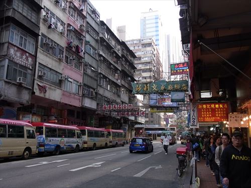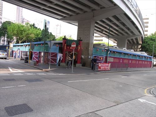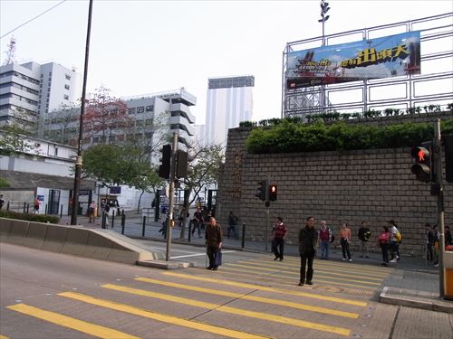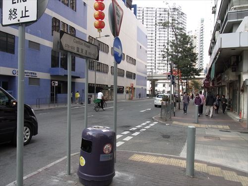 ![]() 新填地街(干拓街 Reclamation Street)の西隣の炮台街(battery street)と東西の甘粛街(Kansu St)の交差点から。下の航空写真の中下左あたり |