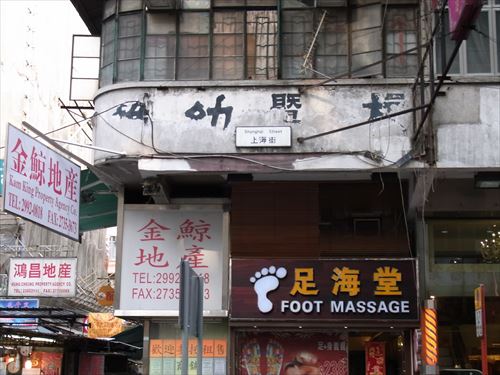 ![]() 南京街を東に40m進むと上海街と交差する。この写真の足海堂、金鯨地産。鴻昌地産は看板とも2023/12現在不変。 |