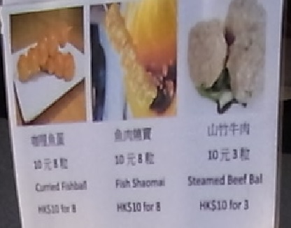 ![]() メニューは左から 茶葉蛋(chá yè dàn,Tea egg hard-boiled) ゆで卵の殻にひびを入れてから茶葉や醤油、香辛料などとともに煮込んだもの。 格仔餅(grid-cake the waffle ワッフル)peanuts butter milk sugar ピーナッツバターをトッピングするのが香港流 雛蛋仔(Egg Puffs 鶏蛋仔とも呼ぶ エッグワッフル) 発酵させた卵の生地を、半球状の2枚のプレートにはさんで 火を通して作る。ふつうはプレーンのものを熱い状態で食べる が、イチゴやココナッツ、チョコレートなど果物その他のフレ ーバーがついたものもある。 |