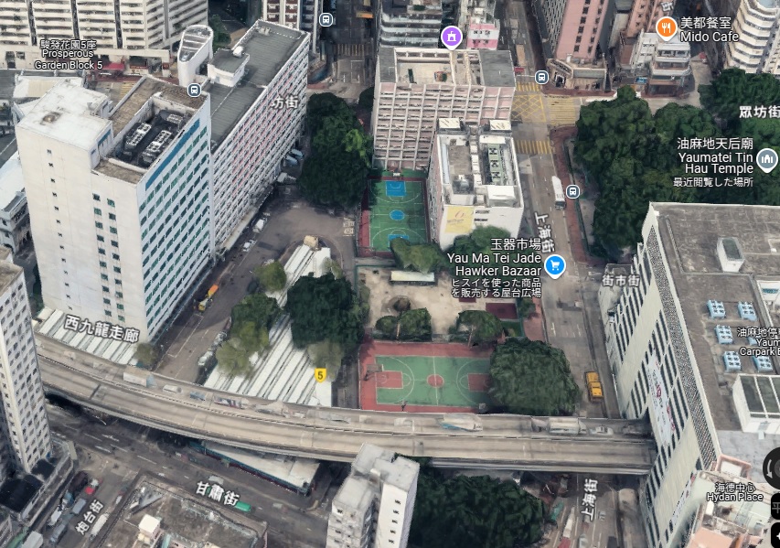 ![]() 玉器市場(ヒスイ市)。高架下にある。東南の方から香港ジョッキークラブがある上海街の1つ西の通りである新填地街(干拓街 Reclamation Street)と東西の甘粛街(Kansu St)の交差点から。下の航空写真の中下あたり |