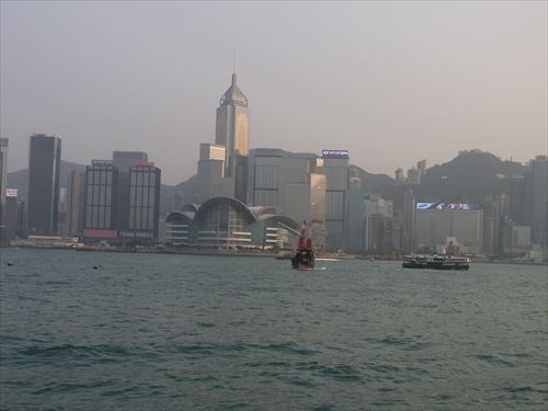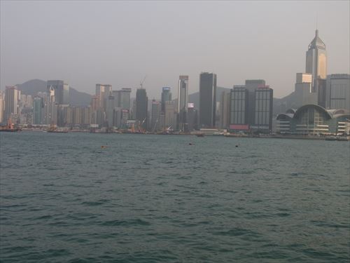 ![]() 中央は香港会議展覧中心(Hong kong Convention and Exhibition Centre)。奥のビルは“The Cat Scratch or The Big Syringe”‒ 中環廣場 Central Plaza 湾仔にある78階建て(374m)のタワー。92年にエンパイアステートビルを意識して建てられ、96年までアジア一高いビルだった。 |