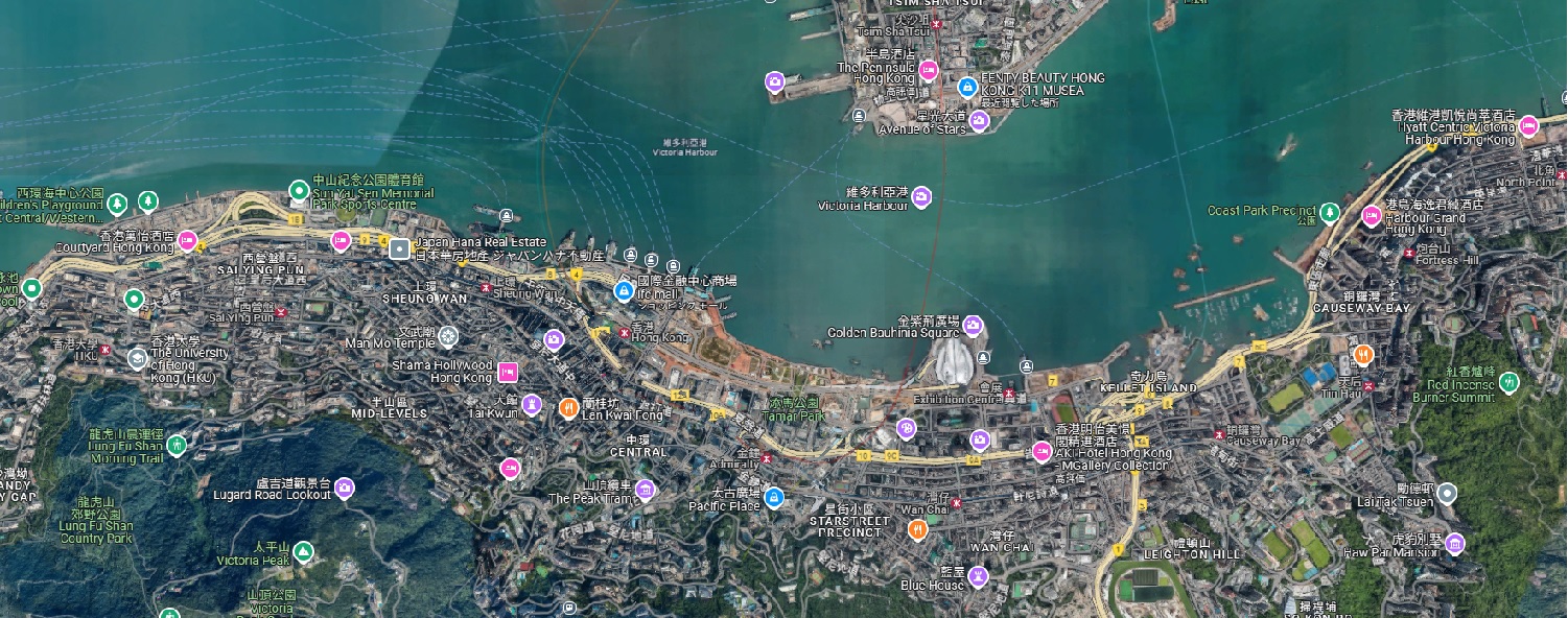 ![]() PHILIPSの広告塔があるのが中環広場(Central Plaza) HYUNDAIの広告塔があるのが連邦政府庁舎(Revenue Tower)、SAMSUNGの広告塔があるのが 夏愨大廈(harcourt house) |