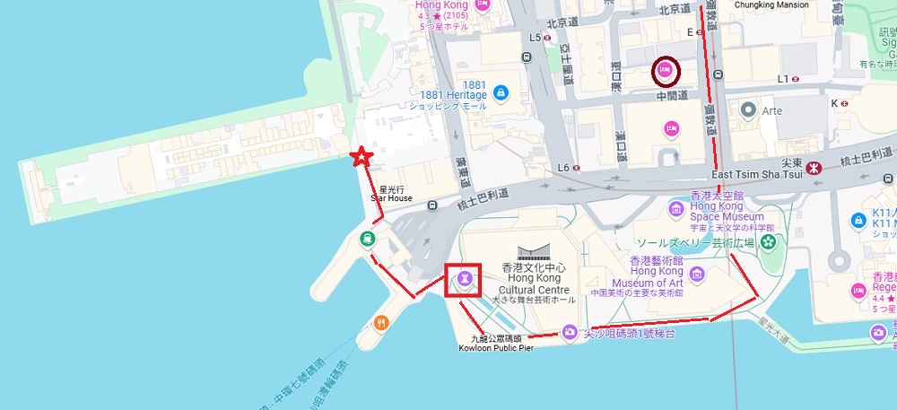 ![]() 赤い丸はペニンシュラ。赤い四角は旧九広鉄路鐘楼 星はオーシャンターミナル入口 |