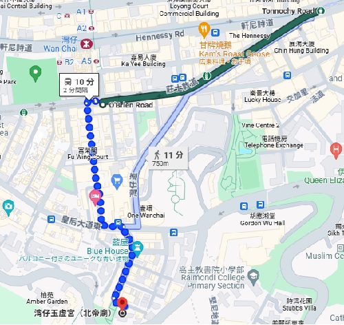![]() 地下鉄 油麻地駅→全灣線Tsuen Wan Line(金鐘Adminiralty駅乗換)港島線(Island Line)→ 灣仔(Wan Chai) 右のビルはWangNang Plaza で灣仔駅を降りて東に200mのところにあるHennessy Rd(軒尼詩道)にある |