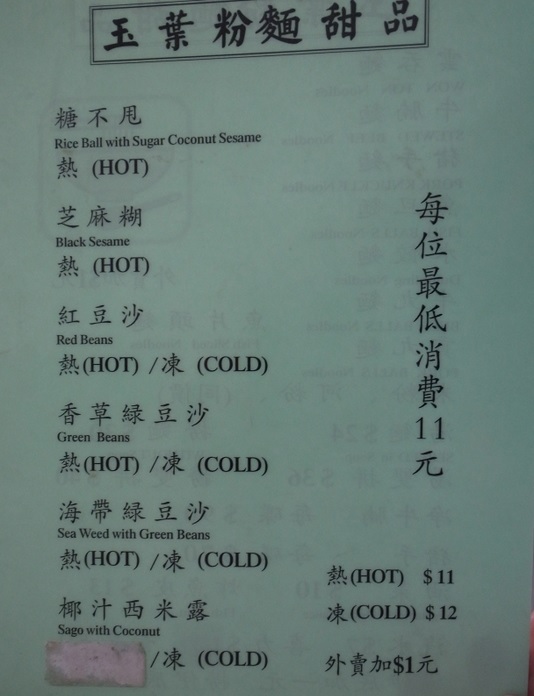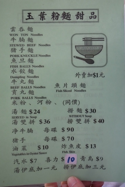 ![]() 上の写真の拡大。左は2014年のメニュー表。1元=1HD≒10円 糖不甩(Rice Ball with Sugar Cocomut Sesame / ココナッツパウダーの掛かったモッチモチ団子) 芝麻糊(Black Sesame / 真っ黒なゴマ汁粉) 紅豆沙(Red Beans / あずきのお汁粉) 香草緑豆沙(Green Beans / 緑豆のお汁粉) 海帯緑豆沙(Sea Weed with Green Beans / こんぶの入った緑豆のお汁粉) 椰汁西米露(Sago with Coconut / タピオカの入ったココナッツミルク) 雲呑麺(WON TON Noodles / ワンタン麺) 牛腩麺(STEWED BEEF Noodles / 牛のアバラ入り麺) 猪手麺(PORK KNUCKLE Noodles / 豚の手入り麺) 魚旦麺(FISH BALLS Noodles / 魚団子入り麺) 水餃麺(Dumpling Noodles / 餃子入り麺) 牛丸麺(BEEF BALLS Noodles / 牛肉ボール入り麺) 貢丸麺(PORK BALLS Noodles / 豚肉ボール入り麺) 湯麺(汁麺) 20香港ドル/ 撈麺(汁無し麺) 24香港ドル 湯雙拼(具二種入) 29香港ドル / 撈雙拼(具二種入) 33香港ドル 浄牛腩、猪手(牛のアバラのみ、豚の手のみ) 一皿55香港ドル 油菜(Vegetables in Oyster Sauce / 野菜のオイスターソース掛け) 9香港ドル 炸魚皮(Fish Skin / 揚げた魚の皮) 11香港ドル 汽水(ソフトドリンク) 7香港ドル生力(サンミゲル・ビール) 8香港ドル青島(チンタオ・ビール) 9香港ドル |
