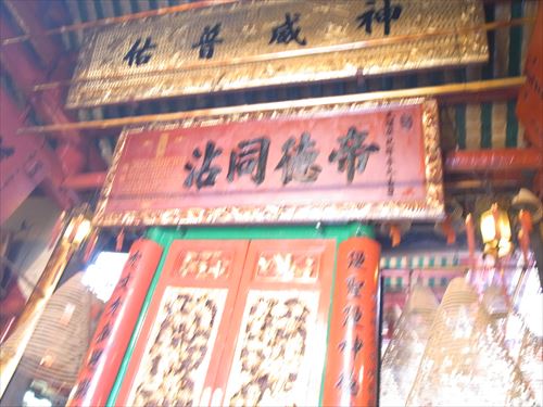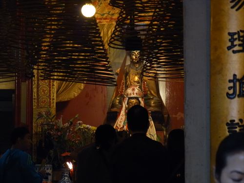 ![]() 文武廟内には、4体の神様が祀られている。塔香(タッホーン)を抜けると、正面に4体が並んでおり、その中央には文武の神様が2体祀られ、右側と左側には1体ずつの神様がある。 |