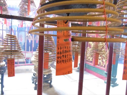 ![]() 塔香(タッホーン)と呼ばれる渦巻状のお線香が天井から吊り下げられている。大きさによって1か月以上も燃え続けるものもある。 |