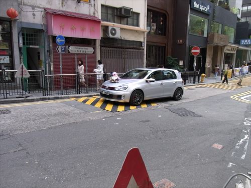 ![]() ゴルフのボンネットの花は新車購入のお祝い?4人乗っているのでハネムーンでは無い。奥の茶色の入口は大平大楼(Tai Ping Mansion) |