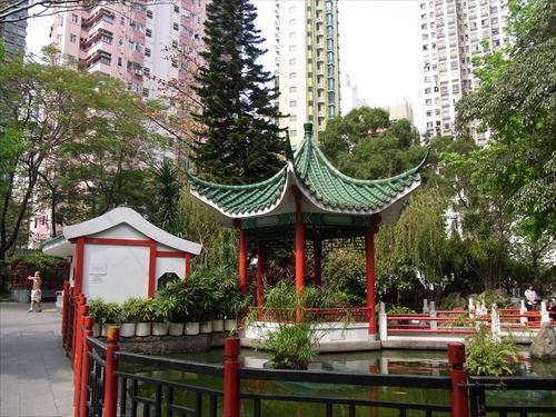 ![]() 純中国式設計で構成されている。入口の門構えや中央の池にあしらわれたあずまや、ベンチやテーブル等も石で造られている。 池には鯉や亀もいる。 |