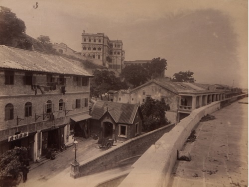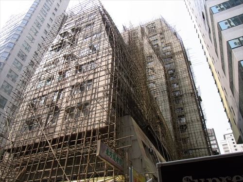 ![]() 竹で足場を組んで修繕中。ここは皇后大道西(Queen's Rd W)通り。 |