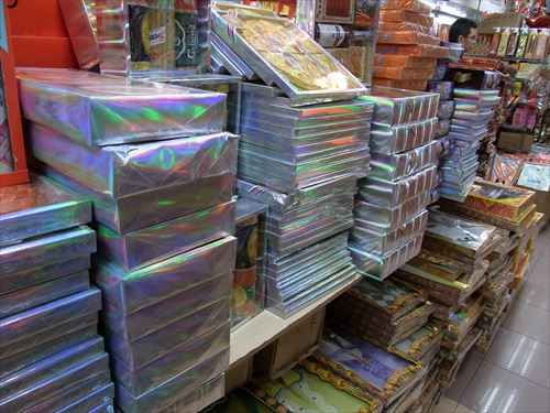 ![]() お供えグッズ販売店。袋入りお供えグッズ。真ん中のはお札があふれている。 |