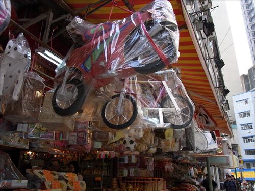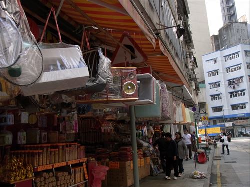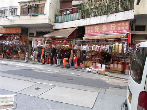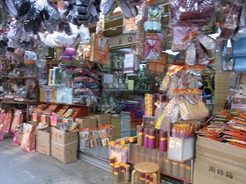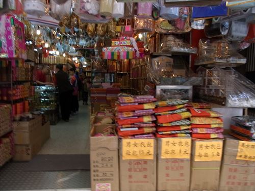 ![]() 雀仔橋(バードブリッジ)の西はお供え物屋が並ぶ |