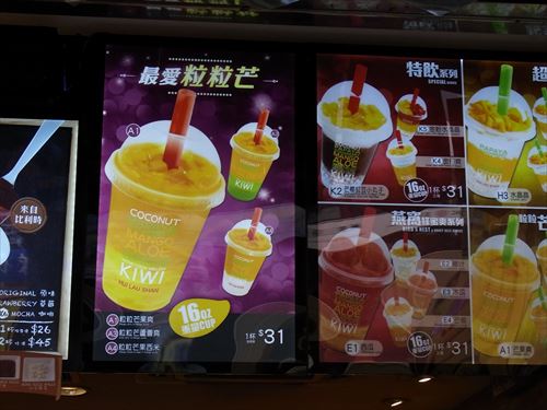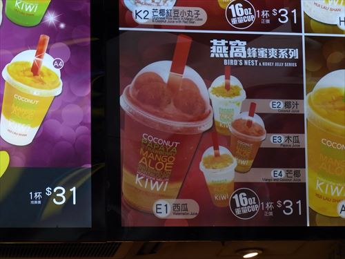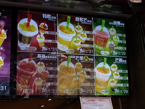 ![]() A1 マンゴゼリー入りココナッツジュース A2 アロエゼリー入りマンゴジュース A4 マンゴキューブとサゴ(ヤシの茎)入りマンゴジュース K5 クリスタルゼリーとマンゴ、ストロベリー K4 はちみつゼリーポメロ(ザボン)とマンゴ H3 クリスタルゼリー |