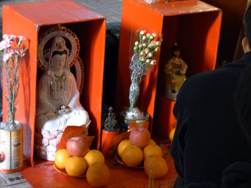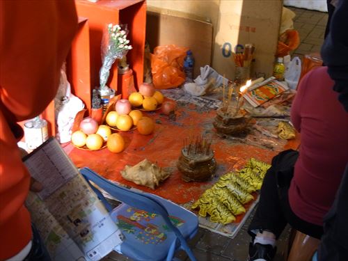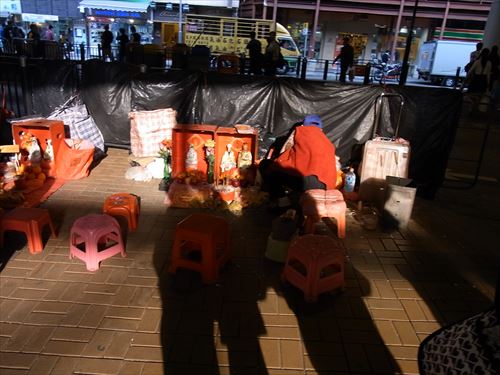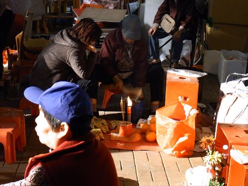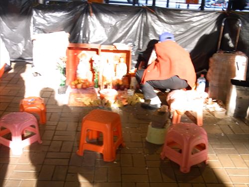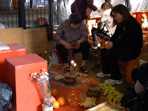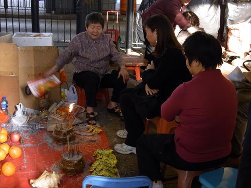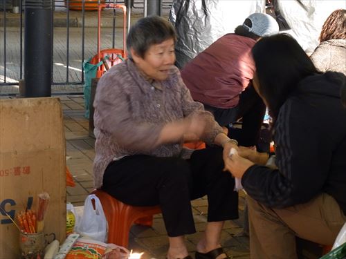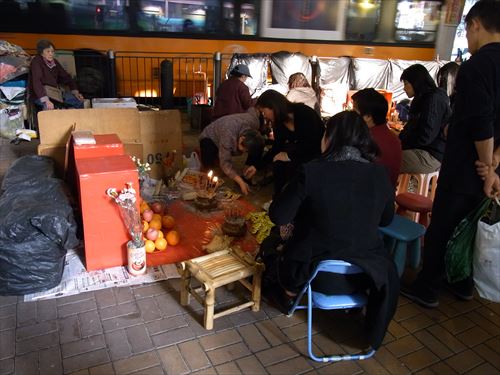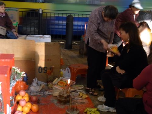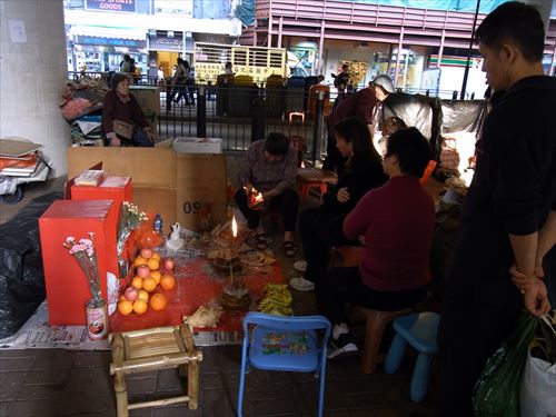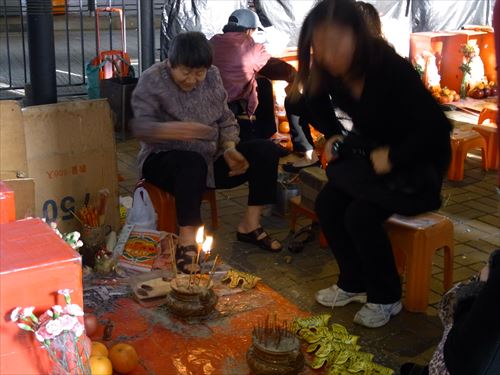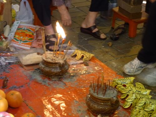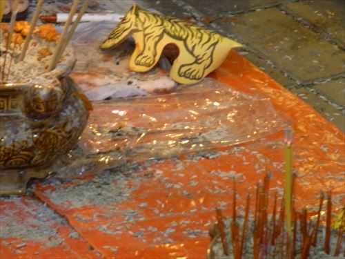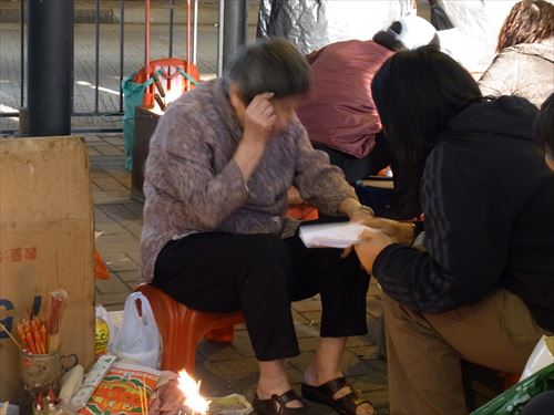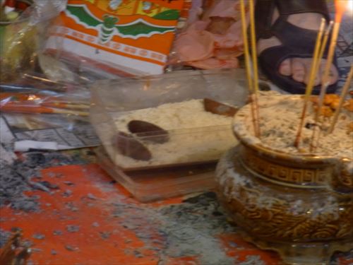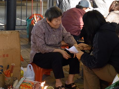 ![]() 「打小人」の儀式は次のとおり ①観音さんやその他の神様(孫悟空、龍王など)を拝む。 ②「小人」の名前を専用の紙に書く。男性小人用と女性小人用の紙がある。 ③ブロックの上に「小人」の紙を包んだ「五鬼紙」を置き、拝神婆が呪文を唱えながらスリッパやくつでベンベンと叩く。紙がぼろぼろになるまで叩く。 ④叩き終わって、それを燃やす。 ⑤「打小人」の後は「祭白虎」。、恨みを解けることができる「大白解」という黄色い紙と、貴人を寄せてくるための「貴人符」という赤い紙で依頼人の頭や背中をなでるようにお払いします。その後、「大白解」と「貴人符」を燃やす。 写真は燃やし終わった後。 |