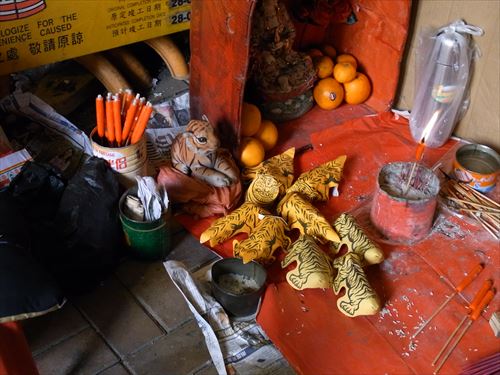虎の絵が描かれた黄色い紙に、豚の脂身を食べさせて、人を傷付けないように祭る。こうして「祭白虎」の習慣が生まれた。 香港特有の風習で百年