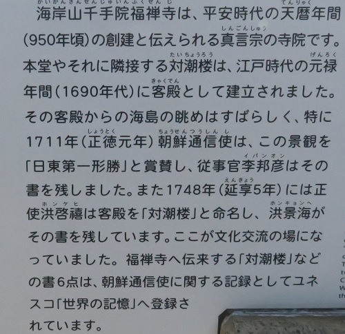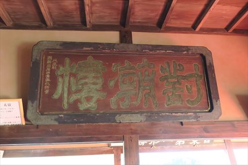 1748年(寛延元年・英祖24年)には第10次通信使の正使である洪啓禧が客殿を「対潮楼」と名づけた書を残し、それを額にしたもの。 |