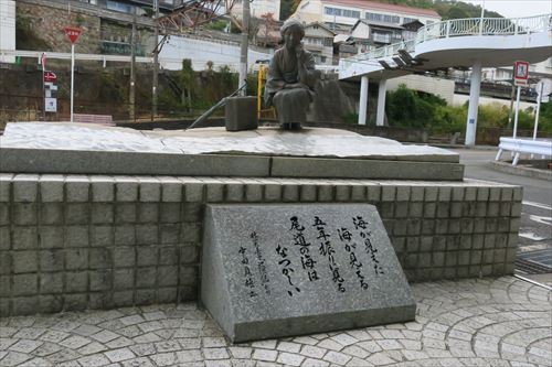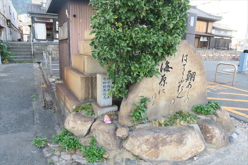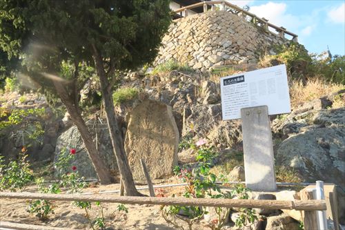 むろの木歌碑。「吾妹子が見し鞆の浦のむろの木はとこ世にあれど見し人ぞなき」 万葉秀歌といわれるこの歌は、天平2年(730年)大伴旅人が太宰府の役人の任期を終え、都へ帰る途中、鞆の浦へ立ち寄った時の歌で、亡き妻をしのぶ気持ちを歌に乗せている。 むろの木は、ヒノキ科の常緑低木の杜松(ねず)か、あるいは這杜松(はいねず)のこと。変わることのない自然と、はかない人間の命の対比のあざやかさが、旅人の悲しみをきわだたせている。 |