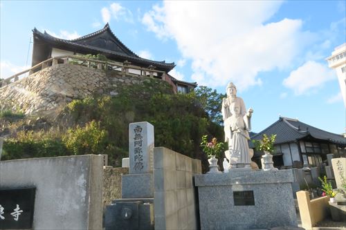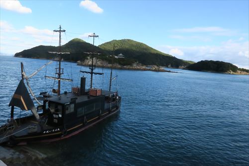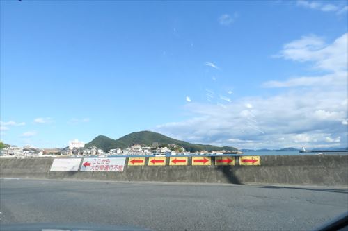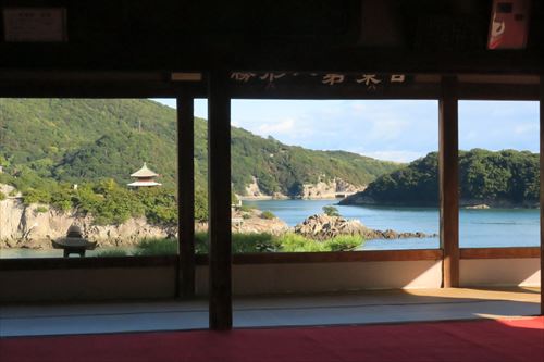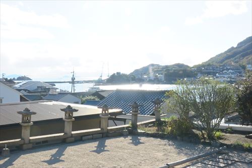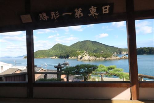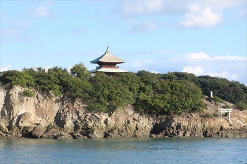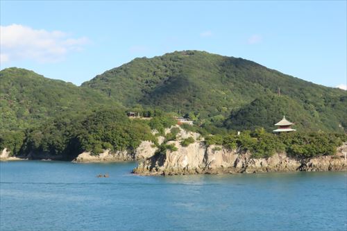 向かいの仙酔島の御前山。東屋の前の碑は行啓記念碑元帥伯爵東郷平八郎謹書 大正15年に、昭和天皇が皇太子時代に、ここから鯛網をご覧になられたらしい。 |