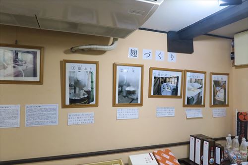 左2つめから ①甑(大型せいろ)おき 甑に洗米して一晩おいたうるち米を入れる。 ②蒸米 米を蒸す ③種付け 蒸された米をからし台に移し麹の種を植え付ける ④切り返し 麹を機械の中で48時間混ぜる ⑤出麹 からし台に戻す |