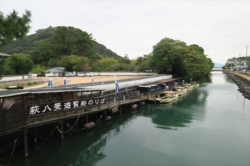 萩八景とは、貞享2年(1685)3代藩主毛利吉就が、お抱え絵師雲谷等璠、歌人安部春貞、学者山田原欽の3人に命じて、新しく萩城下の佳景を選ばせたもの 。 橋本川河口が「倉江の帰帆」「玉江の秋月」 玉江橋を過ぎて旧田中別邸のあたり「桜江の暮雪」。 橋本川右岸の桜並木「小松江の晩鐘」 更に上流が「中津江の夜雨」「上津江の晴嵐」「下津江の落雁」「鶴江の夕照」 船は小松江の晩鐘で折り返すらしい。 |