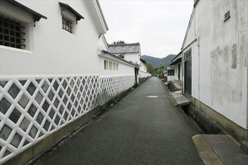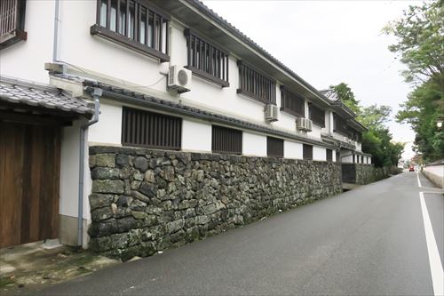 ずっと菊屋の塀が続く。向いの通りの奥に高杉晋作の誕生地がある |
