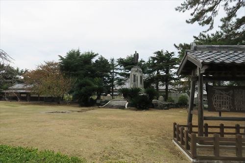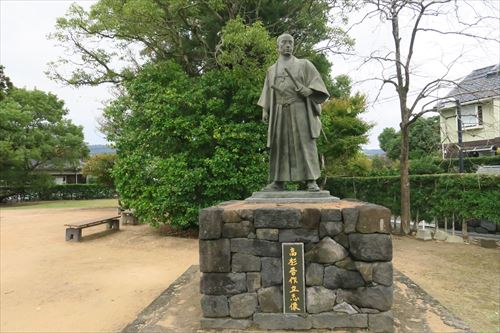 近くの晋作広場にある高杉晋作立志像。萩城を向いて立っている |