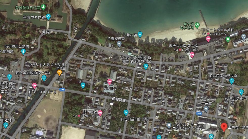 堀内武家屋敷地区 堀内は旧萩城三の丸にあたり、毛利輝元が慶長13年(1608)に指月山に城を築き、町割をおこなったことに始まる。 保存地区は堀内のほぼ全域で、藩の諸役所(御蔵元・御木屋・諸郡御用屋敷・御膳夫所・御徒士所)と、毛利一門をはじめとする大身の武家屋敷が建ち並んでいた。 近世城下町の武家屋敷としての地割が今もよく残り、土塀越しに見える夏みかんとともに歴史的風致を形成。 現在も、地区内には永代家老の益田家の物見矢倉など10数棟の武家屋敷が残る。 昭和51年、全国で最初の「重要伝統的建造物群保存地区」に選定され、伝統的建造物に特定された土塀や石垣は約450件を数え、総延長は約3.5kmに及ぶ。 |