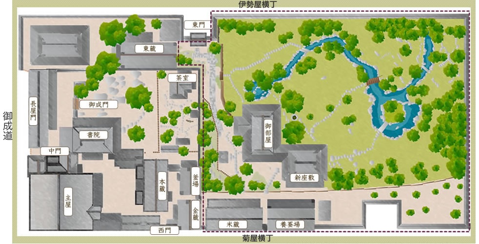 右奥の建物は菊屋家。毛利藩の御用商人。 屋敷は藩の賓客をもてなす迎賓館のような役割を担った。 江戸初期の建築で、現存する大型町家としては最古の部類に属し、400年の歴史がある。 菊屋家は、大内氏時代には武士でしたが、毛利輝元公萩城築城の際には有力町人として萩に入り、 町づくりに尽力。主屋、本蔵、金蔵、米蔵、釜場の5棟が国指定重要文化財に指定され、 約2000坪の敷地の約3分の1が公開されている。 |