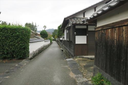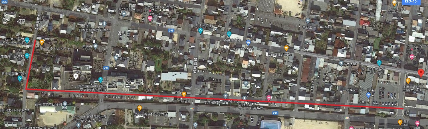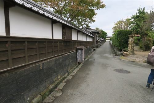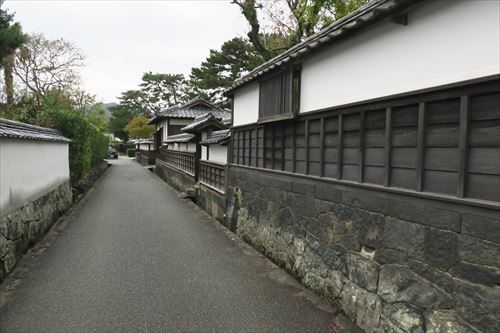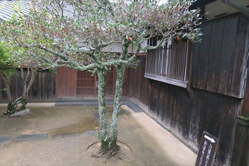 右は木戸孝允旧宅の北隣の旧佐伯丹下家屋敷。 佐伯丹下は萩藩大組に属し、幕末期、「直目付(じきめつけ)」=藩士の職務等を監察する役目や、「撫育方(ぶいくがた)仕組掛」=藩の別途会計を管理する役所を改善する役目、「奥番頭役(おくばんがしらやく)」=藩主の側に仕え殿中の諸事一切を統括する役目など藩の要職を歴任。1872年(明治5年)に65歳で亡くなるまで、この家に住んでいた。 |