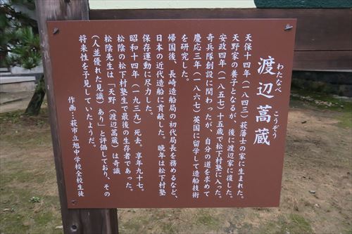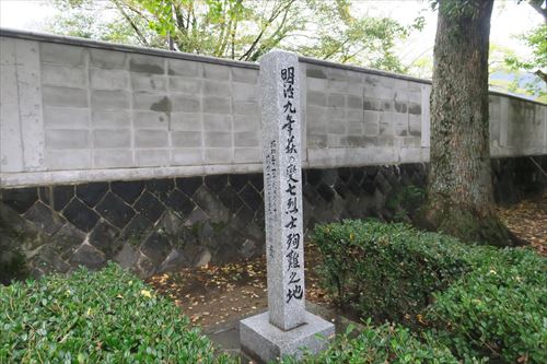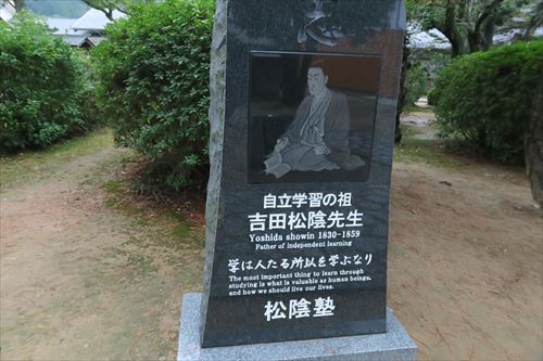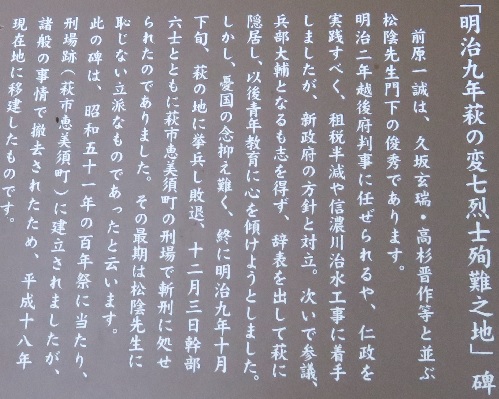 来た道を振り返る。左の茅葺きの家は玉木文之進旧宅。 松下村塾の創始者であり、吉田松陰の叔父である玉木文之進は、文化7年(1810)萩藩士杉七兵衛の三男として生まれ、11歳のときに叔父の玉木正路(十右衛門)の跡を継いだ。 天保13年(1842)、自宅に近所の子供たちを集め私塾を開いた。これが松下村塾の起こりで、ここで松陰も学んだ。 松陰が10歳で藩校明倫館の助教授となったときの後見人でもあり、性格は謹厳、剛直 明治9年(1876)の秋、前原一誠の起こした萩の乱を阻止出来ず、養嗣子(乃木大将の実弟)正誼をはじめ門弟が多く参加したことから「自己の教育責任を、一死以ってこれを償ふ」と言い、自刃した。享年66 建物は木造茅葺き平屋建てで、8畳の座敷のほか4畳の畳部屋・3畳半の玄関、4畳半の板間と土間の台所があり、別に湯殿・便所がある。 |