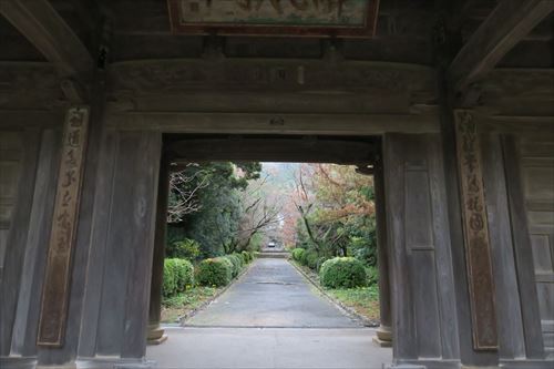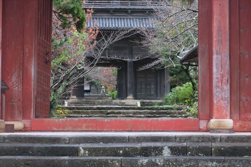 東光寺総門。 東光寺開山の慧極禅師は当寺が創建された翌年の元禄五年九月に晋山し、総門はその頃竣工したものと推定される。 総門正面には慧極筆の「護国山」の額が掲げてあり「元禄癸酉六年孟春吉日(1693)」と記されている。 三間二戸八脚門(正面柱間が三間、側面柱間が二間、左柱間に扉、右柱間に板壁、八つの控え柱を持つ)、一重切妻造段違本瓦葺きで、棟の端にはシャチ(鯱)の代わりに摩伽羅を飾り、中央持ち上げの棟式屋根は黄檗風の様式。 材料はクサマキ・マツ等の用材の表面全体にベンガラが塗ってある。 総門右横の石柱を禁牌石と言い、「葷酒山門に入るを許さず」と読む 意味は「葷(にんにくや韮など匂いの強い物)を食べたり、酒に酔った者の入山を禁止する」。戒を厳しく遵守する禅宗の姿勢を表している。 |