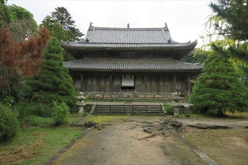 大雄宝殿(本堂)は元禄十一年(1698年)十二月に竣工。 一重裳階付き、入母屋造、本瓦葺きで、用材はクサマキ。 組物は三ツ斗出組構えで、前面一間通りは吹放しで、左右と背面の入側は化粧屋根裏、中央は格子天井組など複雑な建築技術を駆使した唐様式の仏殿。 黄檗宗では本堂を大雄宝殿と呼び、「お釈迦様のいらっしゃる所」という意。 堂内は土間叩仕上げで、中国明時代の法要を継承する黄檗宗の読経は現在でも立ったまま行う。 須彌壇上には本尊として、長寿院夫人(開基毛利吉就公夫人)の寄付にかかる釈迦如来、脇士迦葉尊者、阿難尊者の三尊仏を安置。 柱は全て方柱、大雄宝殿前には、行事や法要の時など堂内に入りきれない人々の為に月台という広場が設けられており、その中央の大きな石を梵壇石といい、戒律を破った僧が懺悔のため坐らされたという。 同殿は中国風建築物であるため、障子の桟が日本と逆に外側にある。また、屋根の中央にあげた火焔付き二重宝珠が黄檗風で、正面中央の半扉には桃(中国における魔除けの果物)の画が彫られていて桃戸という。 |