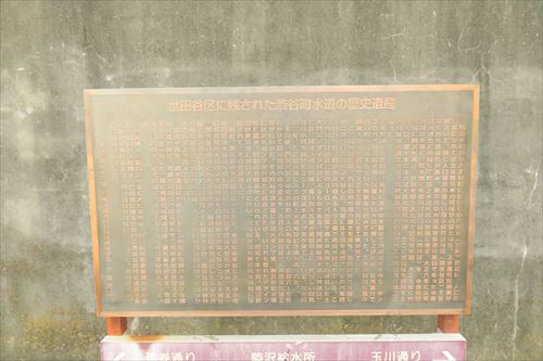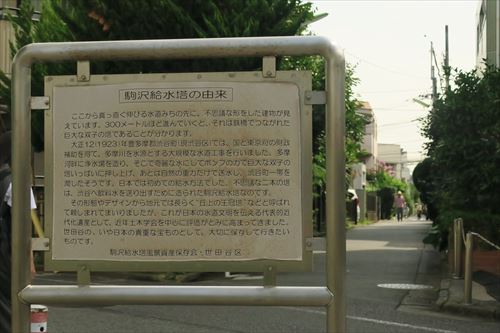 詳しくは次のとおり 大正の初期からどんどん発展し、人口が増加するにつれて井戸水が枯れたり水質が悪くなったりして飲料水が不足し、町営水道の創設が待たれれるようになった。 大正6(1917)年10月水道を渋谷町が単独で敷設することが決まり、次の実施計画に取りかかった。 「水源は多摩川とし、当時の「東京府北多摩郡砧村字鎌田地先」の多摩川の川底に「集水埋渠(しゅうすいまいきょ)」という装置を構築して取水。これは多摩川の川底を流れる伏流水を採るしくみ。採った水は、同河畔の砧浄水場(現在の砧下浄水所)で濾過した後、ポンプで東京府荏原郡駒沢村字新町に設置した駒沢給水場内の給水塔に送られ、給水塔からは渋谷町の町内に自然流下で配水。給水区域は渋谷町全域とし、給水量は一人一日最大約110リットル。」 大正10(1921)年5月起工式が行われ、大正12(1923)年3月 第2号給水塔(北側)が先に完成。5月に町内の一部へ給水開始。 大正12(1929)年量水室を建設、英国製ヴェンチュリーメーターを設置。9月に関東大震災が発するが給水塔に被害無。11月に第1号給水塔(南側)が完成。 大正13(1924)年3月 1号塔と2号塔がトラス橋で結ばれ、全工事終了. 時の内務大臣水野練太郎氏筆の銘板を、それぞれの塔にはめ込み盛大な竣工式が行われた。 |