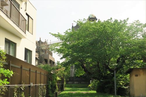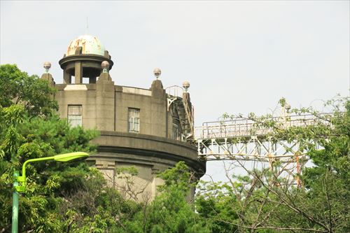 屋根は外からは見えませんが、平均10㎝の厚さの鉄筋コンクリートで覆われ、塔の内部中央に6本の支柱を立てて、屋根を支持しています。さらにその上に和風の四阿(あずまや)を形どり、屋根を欧風のドーム状にふき上げたパーゴラを設置しています。 |