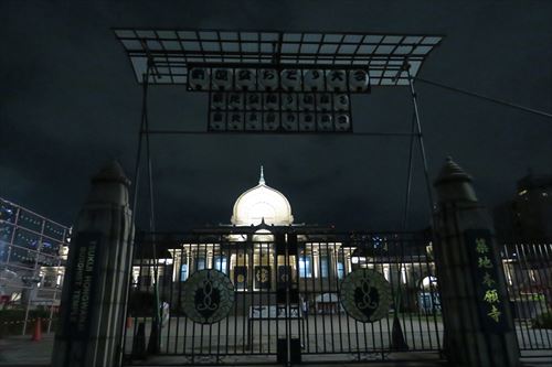 築地本願寺。西本願寺派。当初は1617年に浅草近くに創建されたが、1657年の「明暦の大火」で焼失。再建のため江戸幕府から与えられた土地は海上で、海を埋め立てて土地を築き本堂を建立。それが「築地」の名称の由来。1923年に関東大震災で再度本堂を焼失。1934年に再建し現在に至る。 現在の本堂は、東京帝国大学名誉教授の伊東忠太博士が設計。建築研究のためアジア各国を旅した博士と、時を同じく、仏教伝来ルートを明らかにするために探検隊を結成し、シルクロードを旅した大谷光瑞(当時の浄土真宗本願寺派門主)との出会いが縁となっている。 |