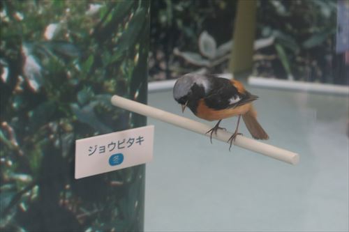 全長15cm。オスは頭が銀白色、顔は黒色、腹は赤茶色。メスは体が灰色味のある茶色。翼に白斑がある。名前のジョウは「尉」で銀髪のこと。ヒタキは「火焚」で、火打石をたたく音に似た音を出すことからジョウビタキ。翼にある白い斑点をキモノの紋に見たてて、モンツキドリという地方がある。 |