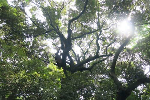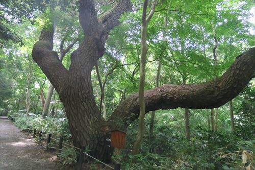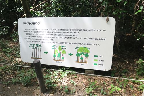大正時代の文献によれば、かつてはモミ、スギ、マツといった針葉樹が林を形成していた。しかし、明治神宮造営のための大規模な移植や、近接道路からの大気汚染などから針葉樹は激減してしまい、現在は落葉広葉樹が主体の森となっている |