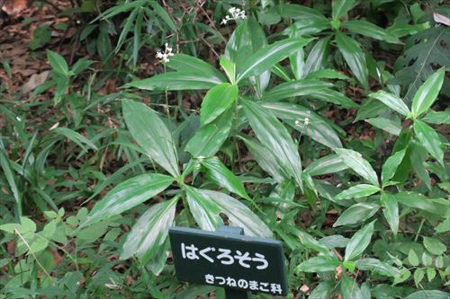 写真の白いのはヤブミョウガ。ハグロソウの花は薄紅紫で2枚の苞(ほう)のうち、大きい1枚は卵形で、長さ1.3-2cm、幅0.7-1.3cm、小さい1枚は卵状長楕円形で、長さ1-1.5cm、幅4-8mm、 |