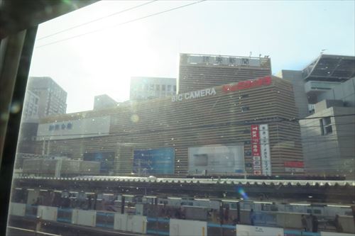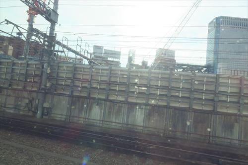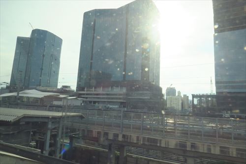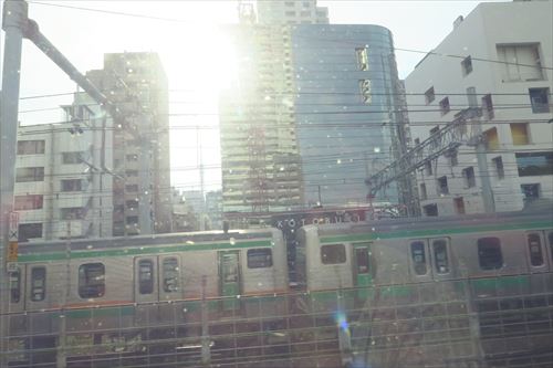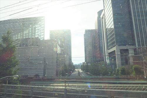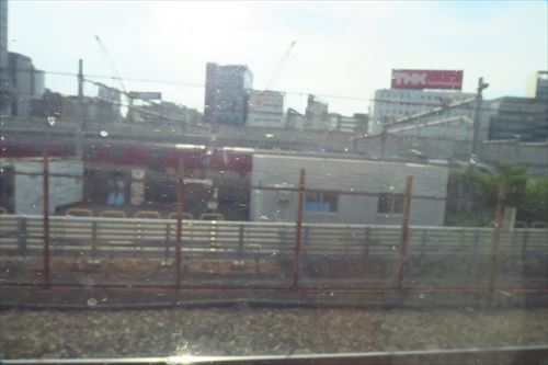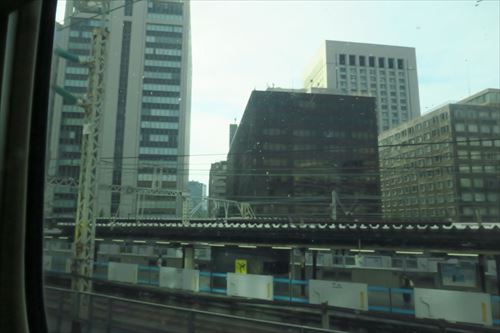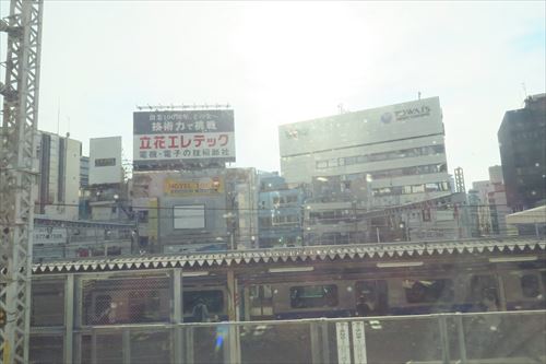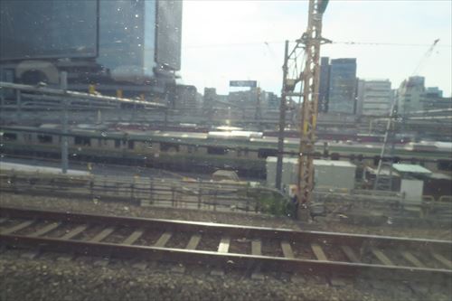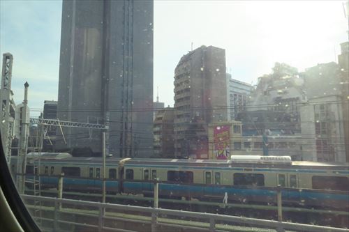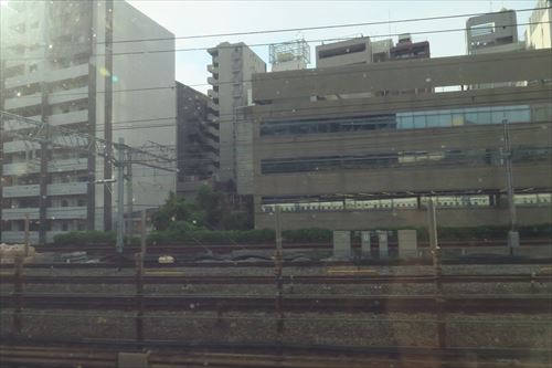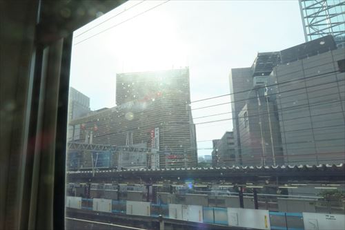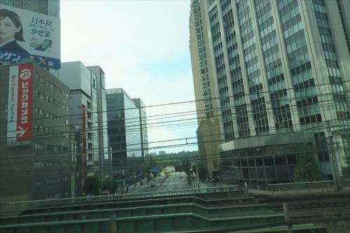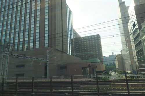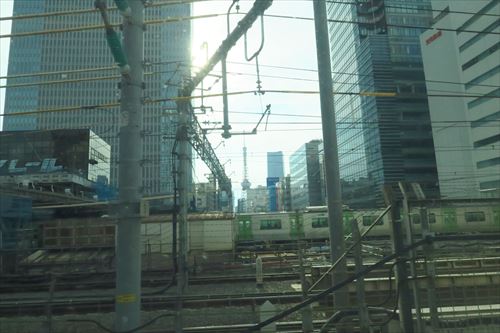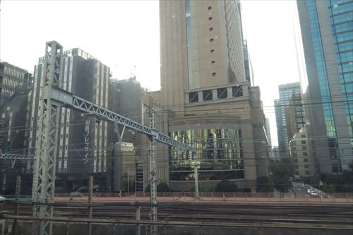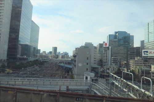 田町駅付近。赤いのはサンライズ瀬戸 右奥のTHK(金属部品)の看板は泉岳寺駅隣の国際興業三田第2ビル |