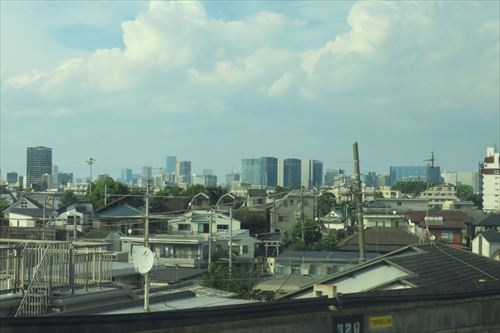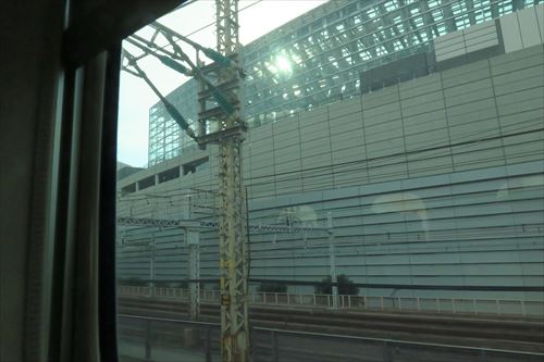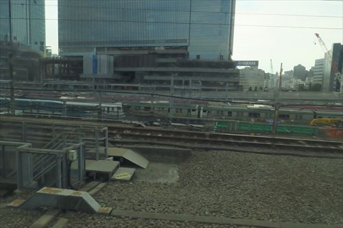 手前の白と青はE257系。踊り子号で熱海で分割し9両基本編成が伊豆急下田、5両附属編成が修善寺に行く。熱海からはJR東海になるので乗務員も交替する。越境するのは南紀(名古屋-紀伊勝浦)、サンライズ瀬戸(JR東日本、東海、西日本、四国)など 奥は左から高輪ゲートウエイ住宅棟、複合棟Ⅱ、複合棟ⅠNorth |