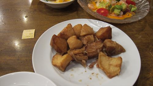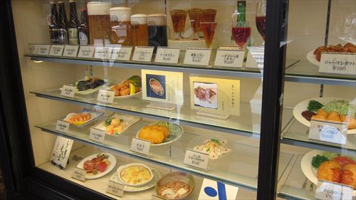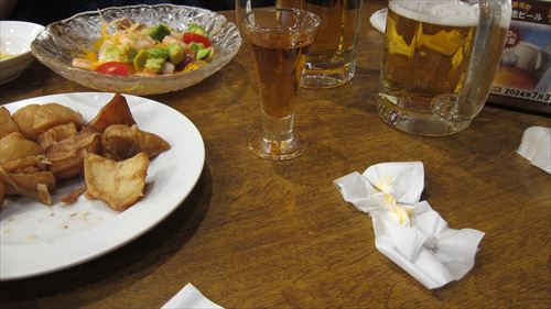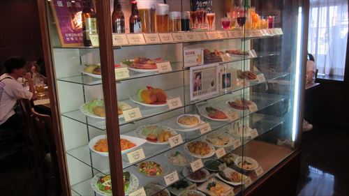 左上から熟撰750円、黒生小びん650円、朝日スタウト750円、ギネススタウト900円、生大1450円、生中1050円、生小700円、ハーフ&ハーフ800円、電気ブラン400円、電気ブラン オールド600円、ハチブド―酒600円、梅酒500円、?、電気ソーダ600円、電気ブランデーサワー650円、アップルジンジャ―ハイボールだ 上から2段目 ハンバーグ1100円、スペアリブ1800円、ビーフシチュー1600円 3段目メンチカツ900円、カニコロッケ1000円、海老フライ、ポークヒレカツ 4段目スパゲッティナポリタン900円、カマンベールチーズ揚げ800円、海老マカロニグラタン950円、ウインナーサラミ盛合せ700円、大皿ソーセージ1700円 5段目チーズサラダ700円、海老とアボガドのサラダ850円、たこのスモークサラダ700円、ジャーマンポテト700円、チーズの盛り合わせ900円、サンドウイッチ800円 最下段奥 茄子しぎ焼き600円、厚切りベーコン、枝豆400円 手前、かれいの唐揚げ700円、真いかの唐揚げ650円、揚げだし豆腐500円 |
